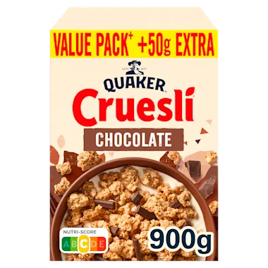 QUAKER CRUESLI® CHOCOLATE is een heerlijke granenmix met goudbruin geroosterde havermout, stukjes pure, Belgische chocolade met de vertrouwde knapperigheid en smaak van Cruesli®.
