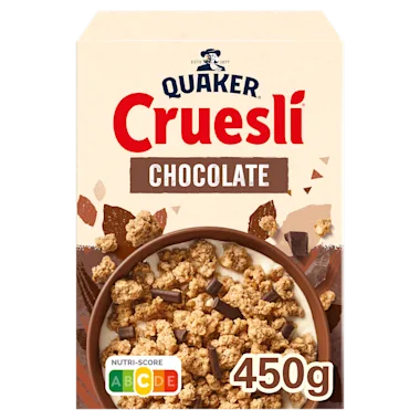 QUAKER CRUESLI® CHOCOLATE is een heerlijke granenmix met goudbruin geroosterde havermout, stukjes pure, Belgische chocolade met de vertrouwde knapperigheid en smaak van Cruesli®.