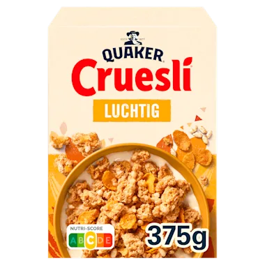 QUAKER CRUESLI® LUCHTIG is een heerlijke granenmix met goudbruin geroosterde havermout, gepofte granen en knapperige cornflakes met de vertrouwde knapperigheid en smaak van Cruesli®.