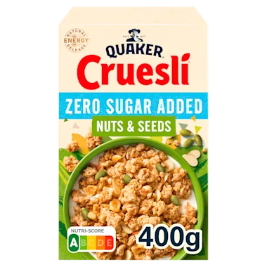 Start je dag lekker zonder toegevoegde suikers. Quaker Cruesli® Zero Sugar Added Nuts & Seeds is een heerlijke, knapperige granenmix met goudbruin geroosterde volkoren havermout met heerlijke stukjes hazelnoot, geroosterde amandelen en pompoenpitten - geproduceerd zonder toegevoegde suikers en zonder zoetstoffen, met de vertrouwde knapperigheid en smaak van Cruesli®. Delicious keeps getting better!