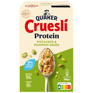 Start je dag lekker en goed met Cruesli® Protein Pistachio & Pumpkin Seeds. De lekkerste smaak en crunch, 23 g proteïne en 21 g voedingsvezels per 100 gram, zonder toegevoegde suikers en/of zoetstoffen en met 97 % volkoren granen.