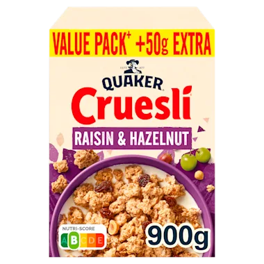 GOEDEMORGEN DÁT IS LEKKER!  Onze smaakmakers hebben voor deze variant gekozen voor een lekker knapperige granenmix met goudbruin geroosterde havermout en heerlijke rozijnen en stukjes hazelnoot. De granen zijn met de grootste zorg geselecteerd en voor 95% volkoren. Hoe lekker is dat?  WIJ ZIJN QUAKER®  De makers van de enige echte krokante muesli volgens ons unieke recept: Cruesli® ! Met 140 jaar ervaring zijn we meesters in het maken van voedzame ontbijtgranen in heerlijke smaakcombinaties. En altijd met havermout: de volkoren krachtpatser die de basis vormt van al onze producten. VALUE PACK⁺ +50g EXTRA.