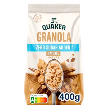 Quaker Cruesli Zero Sugar Added Granola Naturel is een heerlijke, licht geroosterde volkoren granenmix geproduceerd zonder toegevoegde suikers en/of zoetstoffen, rijk aan vezels en met de vertrouwde smaak van Cruesli® Granola