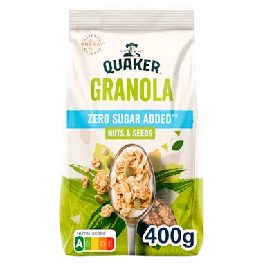 Quaker Cruesli Zero Sugar Added Granola Nuts & Seeds is een heerlijke, licht geroosterde volkoren granenmix met noten & zaden - geproduceerd zonder toegevoegde suikers en/of zoetstoffen, rijk aan vezels en met de vertrouwde smaak van Cruesli Granola