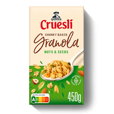 Met elke kom QUAKER® Havermout Granola geniet je van heerlijke VOLKOREN HAVERMOUT krokant geroosterd met noten en zaden. Wist je dat QUAKER® Havermout Granola rijk is aan vezels? Same WEIGHT LESS packaging.