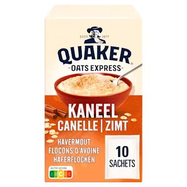 Met elke kom QUAKER Oats Express® Kaneel geniet je van heerlijke 100% VOLKOREN havermout. Quaker Oats Express® Kaneel heeft een heerlijke smaak. Helpt cholesterol verlagen** ** Een portie bevat 33% van de 3 gram beta-glucanen vezels, die dagelijks nodig is om het cholesterolgehalte te verlagen.