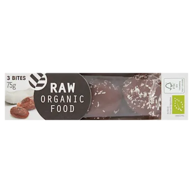 Ingrediënten: Rauwe chocolade* 29% (cacaomassa* 65%, kokosbloesemsuiker*, cacaoboter* 15%), gedroogde dadels* 24%, AMANDELmeel*, agavesiroop*, rozijnen*, kokos* 8%, kokosolie* 3%, *=biologisch
