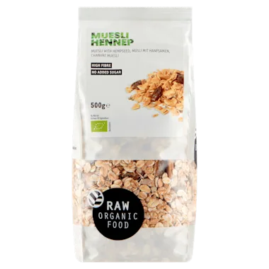 Ingrediënten: TARWEvlokken* 23%, zonnebloempitten* 23%, rozijnen* 17% (rozijnen*, zonnebloemolie*), HAVERvlokken* 10%, GERSTEvlokken* 10%, hennepzaad* 9%, CASHEWNOTEN* 3%, AMANDELEN* 3%, HAZELNOTEN* 3%, *=biologisch