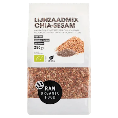 Ingrediënten: Gemalen lijnzaad* 66%, SESAMZAAD* 24%, chiazaad* 10% (Salvia Hispanica), *=biologisch