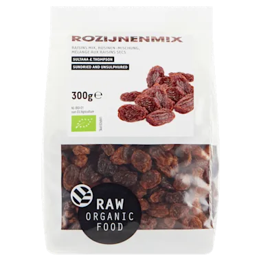 Ingrediënten: Rozijnen* 99% (sultana* 80%, Thompson* 20%), zonnebloemolie*, *=biologisch