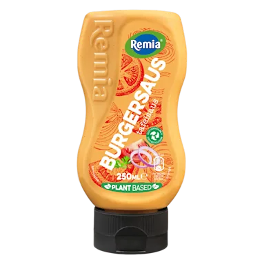 De Remia Tafelsaus Burger is een romige snacksaus bereid met tomaten, fijne kruiden en knapperige ui. Het recept is 100% plantaardig.