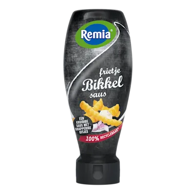 Frietje Bikkelsaus is een gekruide fritessaus met knapperige stukjes ui.