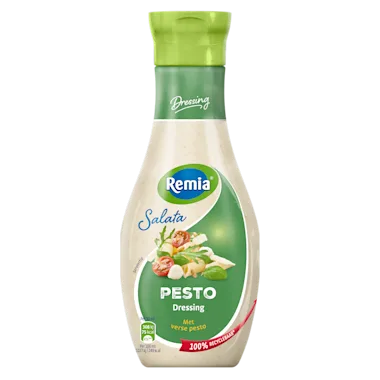 Remia Pesto dressing is een romige dressing bereid met verse pesto en Parmezaanse kaas.