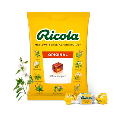 Ingrediënten: Suiker, glucosestroop, extract (1%) van Ricola 13 kruidenmix (weegbree, heemst, munt, tijm, salie, spitslobbige vrouwemantel, vlier, sleutelbloem, gewoon duizendblad, kleine bevernel, ereprijs, kaasjeskruid en malrove), kleurstof (karamel), pepermuntolie, muntolie, menthol. Keelpastille: elke pastille bevat 4,3 mg menthol.