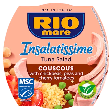 Rio Mare Insalatissime Couscous is een gezonde kant-en-klare salade van de beste kwaliteit tonijn, aangevuld met couscous, kikkererwten, doperwten en kerstomaten. Perfect als lunch of tussendoor. Op kantoor, in het park, onderweg of na het sporten. Vrij van conserveermiddelen. En met MSC keurmerk, dus duurzaam genieten