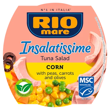 Rio Mare Insalatissime Mais is een gezonde kant-en-klare salade van de beste kwaliteit tonijn, aangevuld met mais, wortelen, erwten en zwarte olijven. Perfect als lunch of tussendoor. Op kantoor, in het park, onderweg of na het sporten. Vrij van conserveermiddelen. En met MSC keurmerk, dus duurzaam genieten