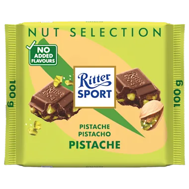 Deze kleurrijke en populaire groene noot springt eruit qua smaak. Het is een onweerstaanbare combinatie van knapperig geroosterde en gezouten pistachenoten omhuld met romige melkchocolade. Ritter Sport Pistache geeft een heerlijk en verantwoord genietmoment. Niet alleen door de populaire combinatie Pistache & Chocolade, maar ook omdat het gemaakt is van natuurlijke, hoogwaardige ingrediënten en duurzaam geproduceerd is.