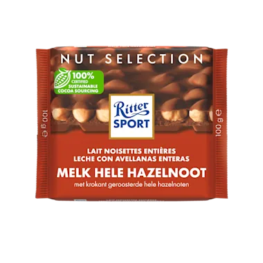 Melkchocolade met hele hazelnoten (25 %). Melkchocolade-deel bevat: ten minste 30 % cacaobestanddelen.