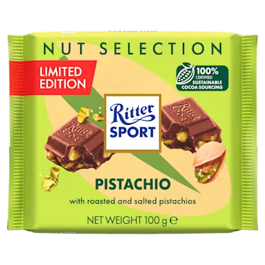 Ritter Sport Pistache geeft een heerlijk en verantwoord genietmoment. Niet alleen door de populaire combinatie Pistache & Chocolade, maar ook omdat het gemaakt is van natuurlijke, hoogwaardige ingrediënten en duurzaam geproduceerd is.