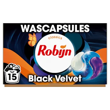 Robijn Classics Black Velvet 3-in-1 Wascapsules met Black Serum, wassen je zwarte was stralend schoon en houden je kleding lang mooi met de heerlijke geur van Robijn. Robijn Black Velvet 3-in-1 Capsules hebben een unieke formule die speciaal is ontwikkeld voor de zwarte was. Het wasmiddel bevat kleurbeschermers die ervoor zorgen dat de vezels en de kleuren van je favoriete kleding langer zwart blijven. De capsules wassen kleding stralend schoon, zonder donkere was te vervagen. Want wat mooi is, moet mooi blijven. De 3-in-1 wascapsules geven je was een langdurige frisse geur en bevatten 92% biologisch afbreekbare ingrediënten. Voor een duurzame was met uitstekende resultaten, zelfs in koude (20 °C) en korte (30 min) wasbeurten. De capsules zijn 100% oplosbaar en verkrijgbaar in een plasticvrije en 100% recyclebare verpakking*.
