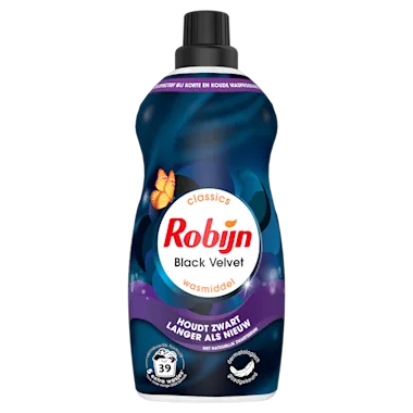 Robijn Klein & Krachtig Classics Black Velvet Vloeibaar Wasmiddel met Care Serum zorgt voor langdurige zwartbescherming van kleding, waardoor je langer geniet van prachtig donker en zwart wasgoed. Het natuurlijke Care Serum zorgt ervoor dat zwart langer zwart blijft, omdat het de vergrauwing van je kleding voorkomt. Dit wasmiddel is speciaal ontwikkeld voor de donkere en zwarte was. Het wasmiddel levert uitstekende resultaten, zelfs in koude (20°C) en korte (30 minuten) wasbeurten, dankzij de verbeterde waskracht en vlekverwijdering. Het laat je was heerlijk ruiken en zorgt ervoor dat je zwarte kleding lang mooi blijft.