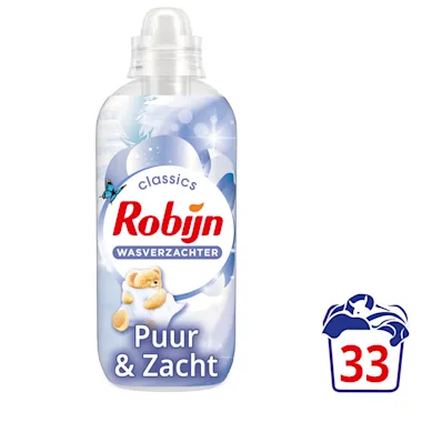 Robijn Classics Puur & Zacht Wasverzachter voor frisse en zachte was. Geniet van de heerlijke geur en langdurige frisheid. Dermatologisch getest en geschikt voor de gevoelige babyhuid. De wasverzachter zorgt ook voor een speciale beschermlaag rondom de vezels van de stof. Hierdoor ontstaat er minder wrijving tussen de vezels, waardoor je kleding minder snel slijt en zijn pasvorm en kleuren behoudt. Je kleding droogt ook sneller en is makkelijker strijkbaar. De Robijn Classics Puur & Zacht Wasverzachter bevat ingrediënten die voor 95% biologisch afbreekbaar zijn*. Bovendien zijn de flessen van Robijn wasverzachter gemaakt van 100% gerecycled plastic. Zo blijft je kleding heerlijk zacht en zorg je tegelijkertijd voor het milieu.