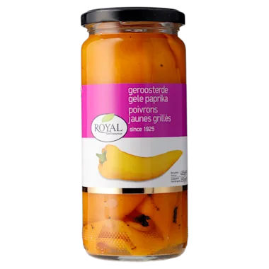 Royal Geroosterde Gele paprika wordt in Turkije geteeld. Vervolgens worden zij met zorg geplukt en schoongemaakt. Ze worden op open vuur geroosterd voor een unieke smaak.