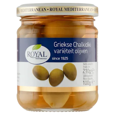 Royal Griekse Chalkidiki olijven zijn grote, ovale, lichtgroene olijven die worden geoogst als ze nog jong zijn en hebben een zachte smaak met een klein beetje pit. Heerlijk voor bij de borrel.