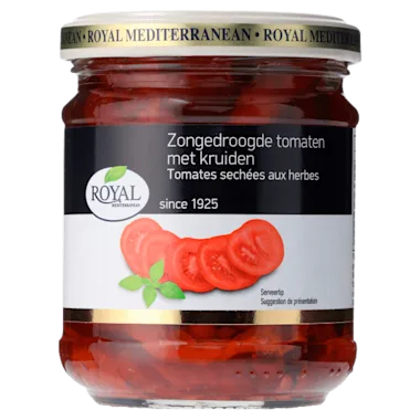 Royal Zongedroogde tomaten met kruiden zijn zongedroogde tomaatjes in een heerlijke melange van kruiden; basilicum, oregano, tijm en dragon. Lekker als antipasti, door de salade of een pasta.