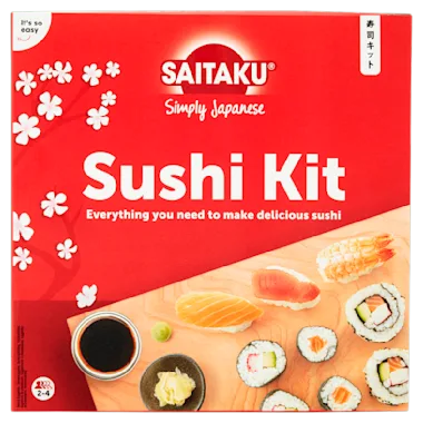 Includes: sushi rice, rice vinegar, soy sauce, sushi nori (seaweed), sushi ginger, wasabi paste, bamboo mat, chopsticks, instruction booklet.