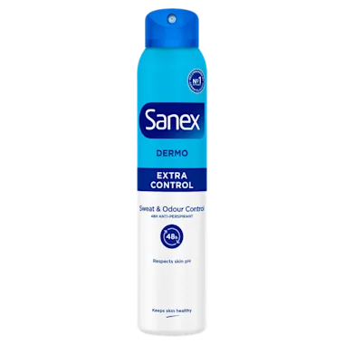 Je kunt de drukste dagen aan wanneer je Sanex Dermo Extra Control anti transpirant deodorant spray gebruikt. Deze anti transpirant spray is speciaal samengesteld om je tot wel 48 uur lang effectief te beschermen tegen zweet en geurtjes, zodat je aan je drukke dag kunt beginnen met één zorg minder. Niet alleen beschermt deze anti transpirant spray je tegen zweet en geurtjes, het verzorgt ook je okselhuid. De anti transpirant spray is dermatologisch getest en speciaal ontwikkeld om de natuurlijke pH-waarde van de huid te herstellen.