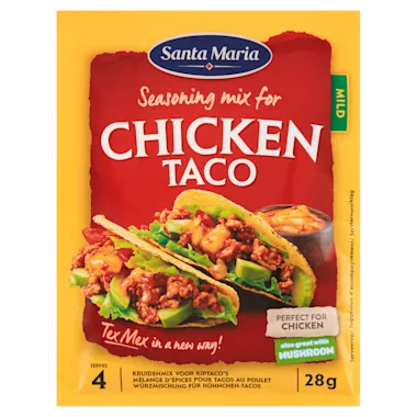 Santa Maria Chicken Taco Seasoning Mix is een kruidenmix voor kip taco's, met heerlijke smaken van oregano, milde chili, knoflook en komijn. Santa Maria Chicken Taco Seasoning Mix is geschikt voor zowel kipgehakt, kipstukjes en vegetarische opties.