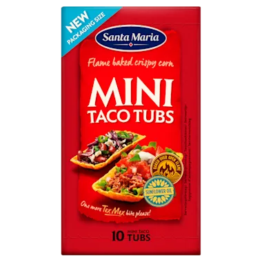 4 porties: 1 pak (10 st.) Santa Maria Mini Taco Tubs, 1 zakje Santa Maria Taco Seasoning Mix, 400-500 g gehakt.