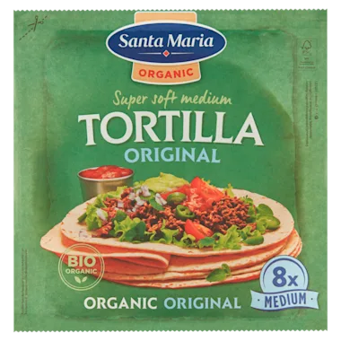 Een zachte tortilla op biologische tarwebloem gebakken. De smaak is goed en zacht met een mooie textuur.