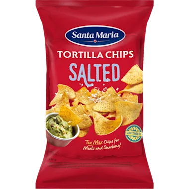 Santa Maria Tortilla Chips Salted zijn krokante licht gezouten driehoekige maïschips. Lekker als borrelgerecht om te dippen in salsasaus of guacamole. Of bereid in oven als nachoschotel, bedekt met kaas en schijfjes jalapeño. Gebakken boven open vuur. Bereid met zonnebloemolie.