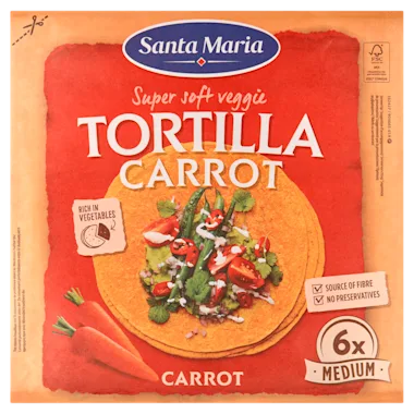 De Santa Maria Wortel Tortilla wrap heeft milde wortel smaak en heeft een mooie natuurlijke kleur. Deze kleurrijke groentetortilla wrap maakt het gemakkelijk om knapperig, voedzaam en smakelijk Tex Mex en Mexicaans eten te bereiden voor familie en vrienden.