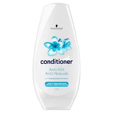 Schwarzkopf conditioner Anti-Klit bevat frangipani extract en is geschikt voor lang of krullend haar.