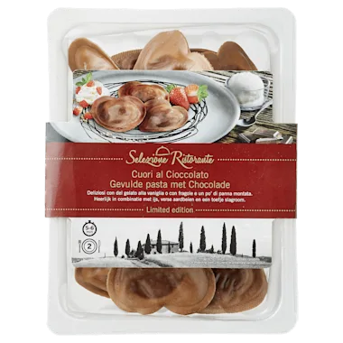 Laat je betoveren door onze gevulde pasta met Chocolade! Serveertip: heerlijk met ijs, verse aardbeien en een toefje slagroom.