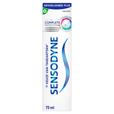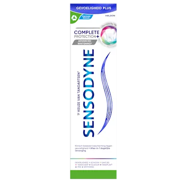Advanced Whitening* voor een nog betere whitening. Met een verfrissende muntsmaak met een twist van natuurlijke extracten. Unieke formule met Advanced Cleaning System voor Superieure Reiniging**. De vezorging bij gevoelige tanden mag niet ten koste gaan van andere belangrijke voordelen. Sensodyne Complete Protection Whitening biedt meerdere mondverzorgingsvoordelen samen met klinisch bewezen bescherming tegen gevoeligheid. Heeft een recyclebare kartonnen en recyclebare plastic tube. Vergeet hem dus niet na gebruik te recyclen.* vs Sensodyne Complete Protection + Cool Mint** vs normale Sensodyne tandpasta"