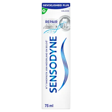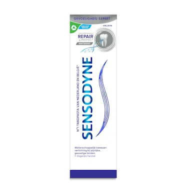 Sensodyne Repair & Protect Deep Repair Whitening dagelijkse tandpasta helpt de kwetsbare plekken van de tand te herstellen en te beschermen. Het is klinisch bewezen dat de unieke NovaMin formule van de tandpasta verlichting geeft bij pijnlijke gevoeligheid. Sensodyne Repair & Protect Deep Repair Whitening dagelijkse tandpasta bevat fluoride om de tanden te helpen versterken. De vernieuwde Sensodyne Repair & Protect Deep Repair Whitening dagelijke tandpasta vormt een harde laag op de kwetsbare plekken van de gevoelige tanden om te helpen bij herstel. Daarnaast helpt Sensodyne Repair & Protect Deep Repair Whitening tandpasta de natuurlijke witheid van je tanden te herstellen.
