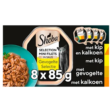 Sheba mini filets is een luxe mix van malse reepjes gevogelte in een smakelijke saus. Het is het perfecte recept om jouw lieveling te verwennen en nu verkrijgbaar in een handige voordeelverpakking van 8 kuipjes!