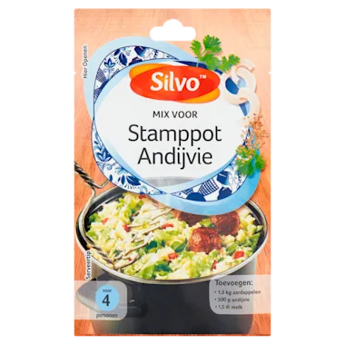 Bereidingswijze . Aardappelen schillen, wassen, in 20 minuten gaar koken en afgieten. . Andijvie wassen en in reepjes snijden. .Intussen de melk koken. . Gekookte aardappelen fijn stampen en met een klontje boter, de mix en de helft van de kokende melk vermengen. . Andijvie in gedeelten door de puree mengen. . Stamppot, indien nodig, wat smeuïger maken met de rest van de melk. .Geen zout of peper toevoegen. Tip . Lekker met een balletje gehakt met de Silvo mix voor gehakt of uitgebakken spekblokjes.