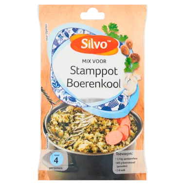 Voor 4 personen Toevoegen: • 1,5 kg aadappelen • 600 g boerenkool (gesneden) • 2 dl melk Bereidingswize • Aardappelen schillen en wassen. • Boerenkool wassen. • Aardappelen en boerenkool in eenpan doen met een laagje water en in 25 minuten gaar koken. • Intrussen de melk koken. • Aardappelen en boerenkool afgieten fijn stampen en met melk en een klontje boter tot een smeuïge massa roeren. • Mix toevoegen en de stamppot al roerend door en door warm laten worden. • Geen zout of peper toevoegen. Tip • Lekker met een stuk rookworst.