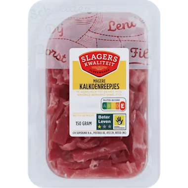 95% kalkoenvlees¹, zout, voedingszuur: E325, conserveermiddel: E262/E250, emulgator: E451, maltodextrine, antioxidant: E301, dextrose, rook.