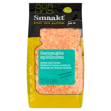 Ingrediënten: Rode splitlinzen 59,9%*, gele splitlinzen* 39,9%*, zonnebloemolie, *=biologisch