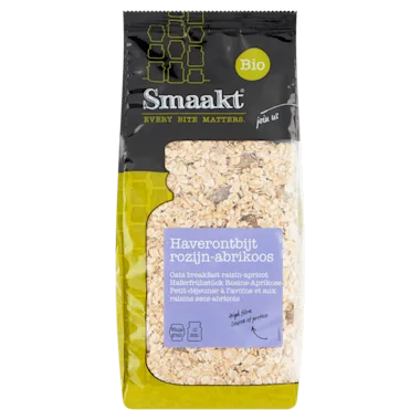 Ingrediënten: HAVERvlokken fijn* 72%, rozijnen* 14% (rozijnen* 99,5%, zonnebloemolie*), gedroogde abrikozenstukjes* 14% (abrikozen* 95%, rijstmeel*), *=biologisch