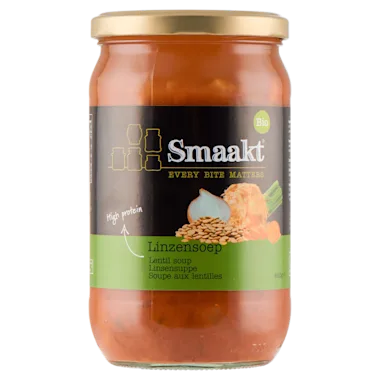 Ingrediënten: Water, tomaten (uit concentraat)*, linzen (bruin)* 18%, wortel* 6,1%, prei* 5,1%, ui* 4,0%, knolSELDERIJ* 1,0%, rijstzetmeel*, zeezout, maismeel*, uipoeder*, SELDERIJblad* 0,02%, zwarte peper*, knoflook*, nootmuskaat*, curcuma*, laurier*, lavas*, *=biologisch