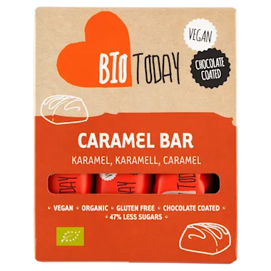 Ingrediënten: Rijststroop*, chocolade* 20% (cacaomassa, kokosbloesemsuiker, cacaoboter)*, tapiocazetmeel*, rijstpoeder* (gedroogde rijstsiroop, rijstzetmeel, rijstbloem)*, karamel* 11% (kokossiroop, kokoscrème, zeezout)*, gedehydrateerde maïssiroop*, cacaoboter*, cacaopoeder*, *=biologisch.