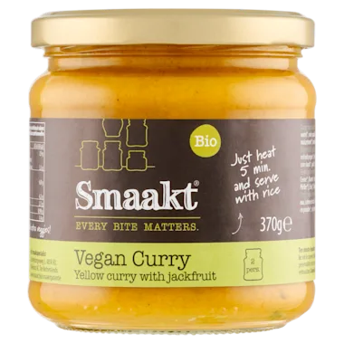 Ingrediënten: Jackfruit* 30%, (jackfruit*, water, zeezout, limoensap*), water, kokoscrème*, wortel*, rode paprika*, prei*, kokosbloesemsuiker*, ui*, zeezout, kerriepoeder* <lt/>1% (kurkuma*, gemberpoeder*, zout, zwarte peper*), azijn*, maïszetmeel*, knoflook*, zuurteregelaar (melkzuur), *=biologisch.