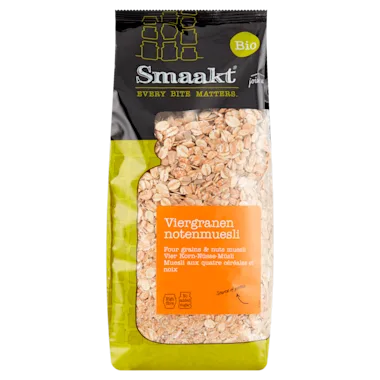 Ingrediënten: HAVERvlokken* 22%, TARWEvlokken* 21%, GERSTvlokken* 19%, ROGGEvlokken* 19%, zonnebloempitten*, WALNOTEN* 4%, CASHEWNOTEN* 3%, AMANDELEN* 2%, HAZELNOTEN* 2%, *=biologisch